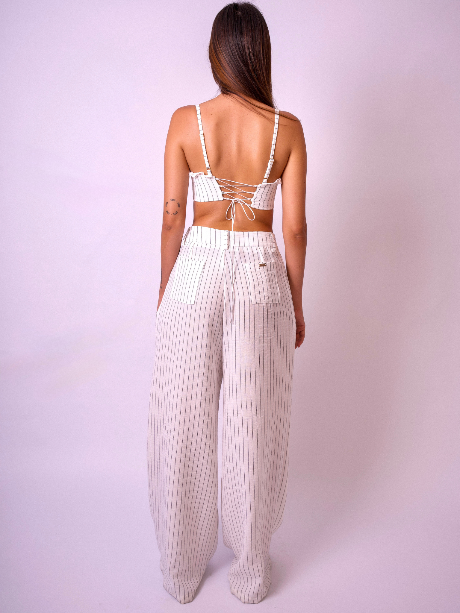 Este palazzo de rayas, con textura y caída similar al lino, combina comodidad y estilo en una sola pieza. Su diseño de rayas verticales alarga visualmente la silueta, mientras que el corte ancho ofrece libertad de movimiento y un toque sofisticado. Versátil para cualquier ocasión: de la oficina a un brunch o una salida nocturna, siempre lucirás impecable.